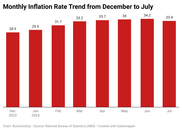 At the same time, inflation figures show a marginal decrease. The NBS reports that overall inflation dropped from 34.19 percent to 33.40 percent in July 2024, and food inflation fell from 40.87 percent to 39.53 percent.