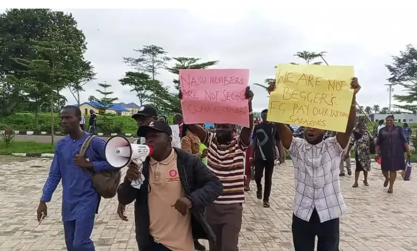 The leadership of the Non-Academic Staff Union of Universities, NASU, and the Senior Staff Association of Nigeria, SSANU, of the Federal University Oye-Ekiti, FUOYE, led their members on a peaceful protest at the main entrance of the institution on Tuesday.
