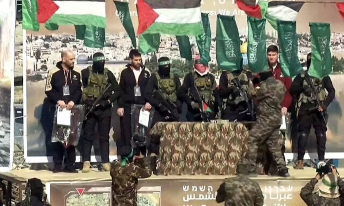 As part of the orchestrated release, the three were handed “release certificates” and other symbolic items, including an embroidered map representing the claimed borders of Palestine.