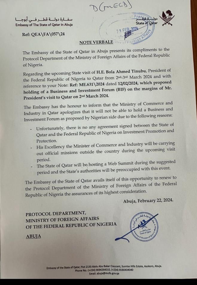 As of the time of this report, there has been no official reaction from either Nigeria’s Ministry of Foreign Affairs or the Embassy of Qatar regarding the leaked document, which has gained traction on social media platforms.