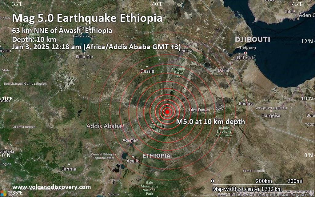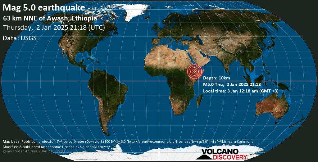Strong mag. 5.0 Earthquake – 63 km north of Āwash, Āfar, Ethiopia, on Friday, Jan 3, 2025, at 12:18 am (Addis Ababa time)